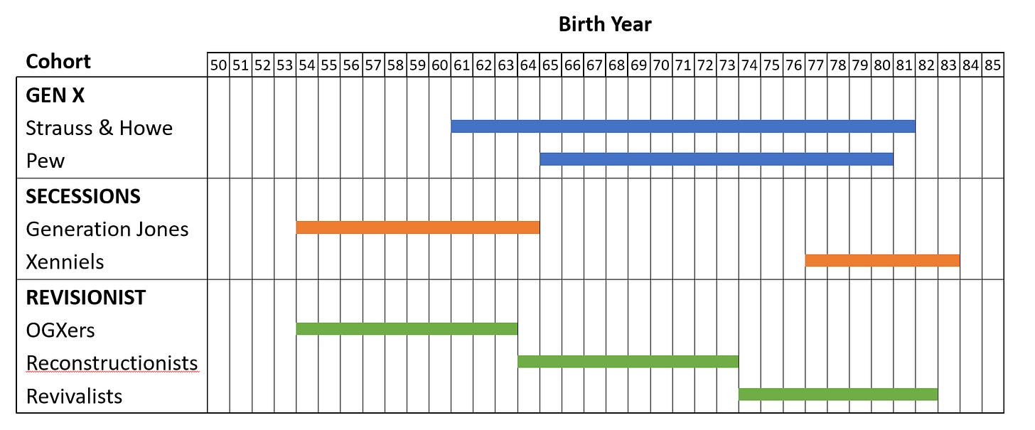 The thing about generational “theory”—the validity of which, as social science2, lies somewhere between scientific Marxism and astrology—is that it is both trivially true and absurd. True because obviously one’s position in history relative to one’s biological age has a large impact on one’s attitudes and consciousness. Absurd because the epochal dividing lines are entirely up for grabs. In other words, an infinite number of periodizations are possible, from the individual and useless—each a cohort of one—to the traditional Strauss & Howe borders, which define Generation X as those born between 1961 and 1981.