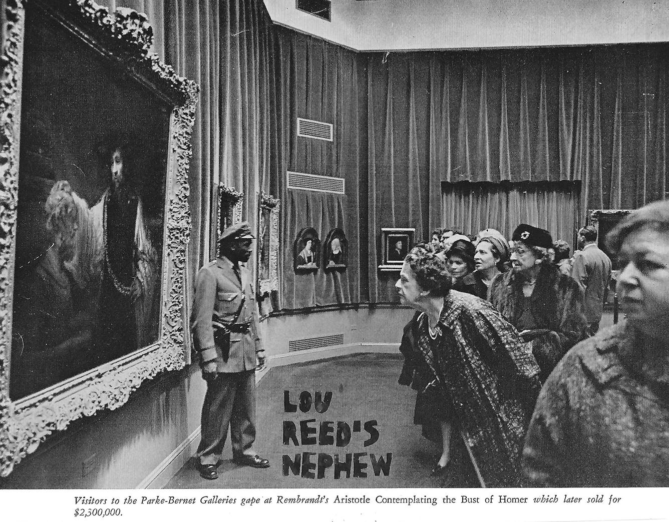 The phrase turned into a series of vignettes about work, art, and tech, which I started posting on Medium in 2012, losing steam with the death of the historical Lou Reed on October 27, 2013. The collages came much later, spontaneously, when I released the long-gestating manuscript to my agent in early 2022. I was sick of words. My wife had been cutting things up and pasting them back together as long as I’d known her. I simply joined in. “Lou Reed’s nephew” had become such a character in our lives that she made what is arguably the first L.R.N. collage by applying block letters to an early-1960s magazine photo with a recursive caption that cannot be improved. It reads: “Visitors to the Parke-Bernet Galleries gape at Rembrandt’s Aristotle Contemplating the Bust of Homer which later sold for $2,300,000.” A copy of a copy of a copy of a copy, guarded by a slouching subject in an ill-fitting uniform (see Fig. 1).