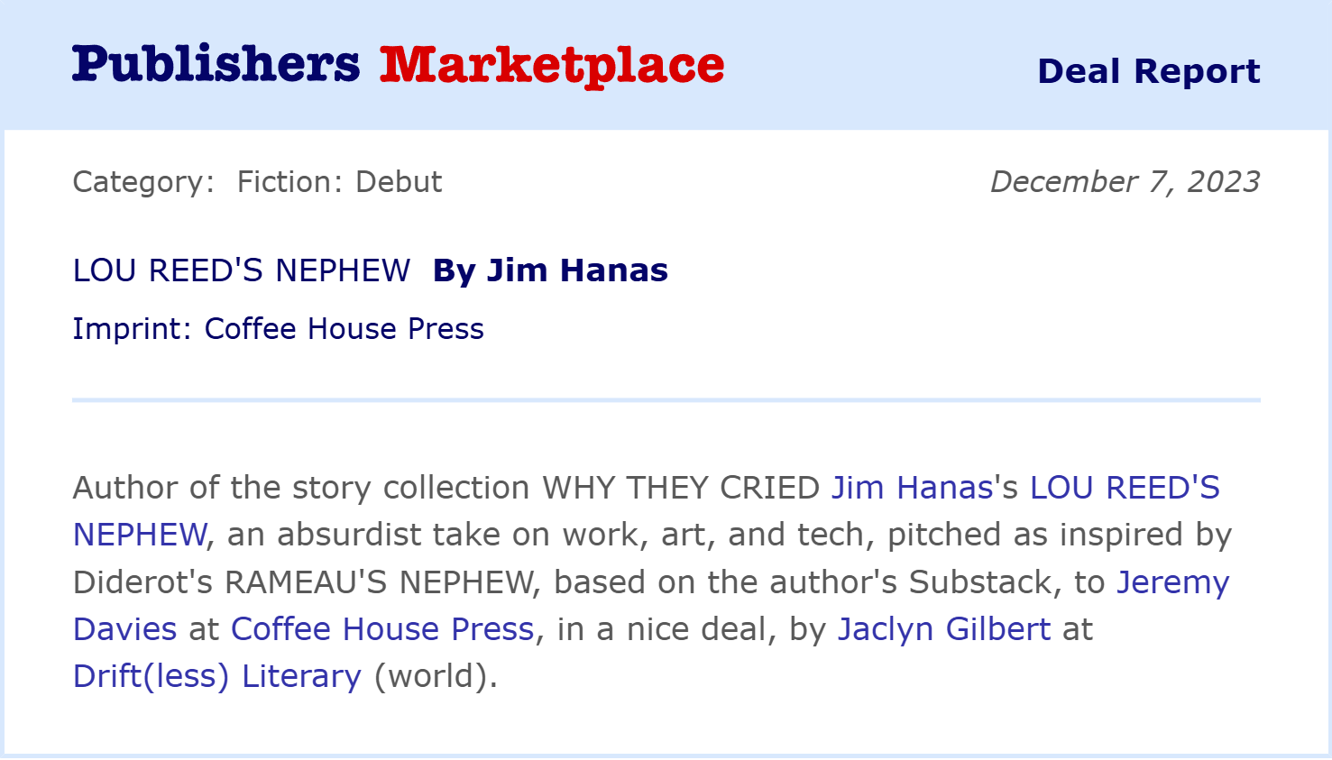 I have heard from family members that some of the above is inscrutable mumbo jumbo, which means I’ve been in publishing too long. I recognize this—on a Pavlovian level, like the color red near the notification bell on Facebook—as the universal signal that “Someone got a book deal!!!” (I’m not alone. This signal pattern is so entrenched that Publishers Marketplace, even a after a recent redesign, allows you to download deal announcements in this “classic” format, lest your followers handle your news like counterfeit currency.)